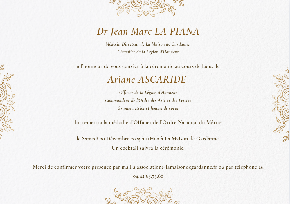 Le Dr Jean Marc La Piana a l’honneur de vous convier à la cérémonie au cours de laquelle Ariane Ascaride lui remettra la médaille d’officier de l’ordre national du mérite